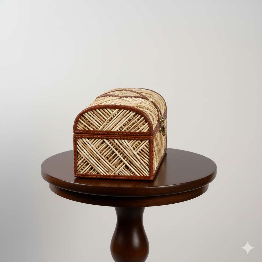 A classic souvenir of Ceylonese craftsmanship, this jewelry box features a stunning mosaic of naturally shed porcupine quills. The contrasting dark wood and ivory-toned quills create a sophisticated, textured aesthetic. The interior is lined with soft velvet, making it a perfect functional heirloom for storing valuables.
